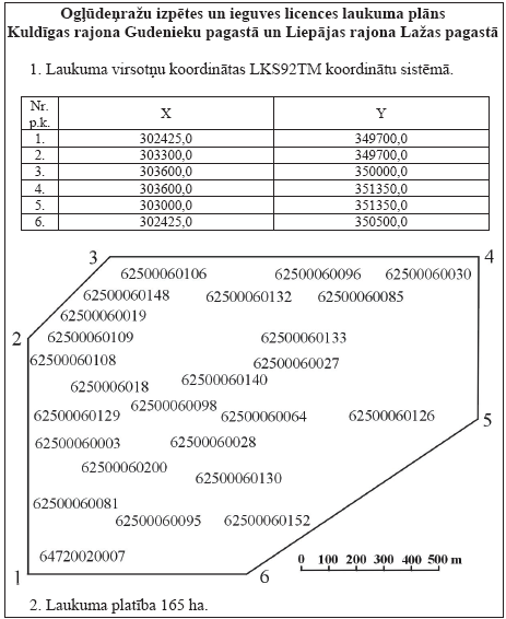 Saskaņā ar likuma “Par zemes dzīlēm” 4.pantu noteikt ogļūdeņražu izpētes un ieguves licences laukumu 165ha platībā (zemes kadastra Nr.62500060003; 62500060006; 62500060018; 62500060019; 62500060027; 62500060130; 62500060200; 62500060028; 62500060064; 6250060095; 62500060096; 62500060085; 64720020007; 62500060108; 62500060109; 62500060081; 62500060098; 62500060140; 62500060152; 62500060030; 62500060106; 62500060126; 62500060132; 62500060133; 62500060148) Kuldīgas rajona Gudenieku pagastā un Liepājas rajona Lažas pagastā (pielikums).