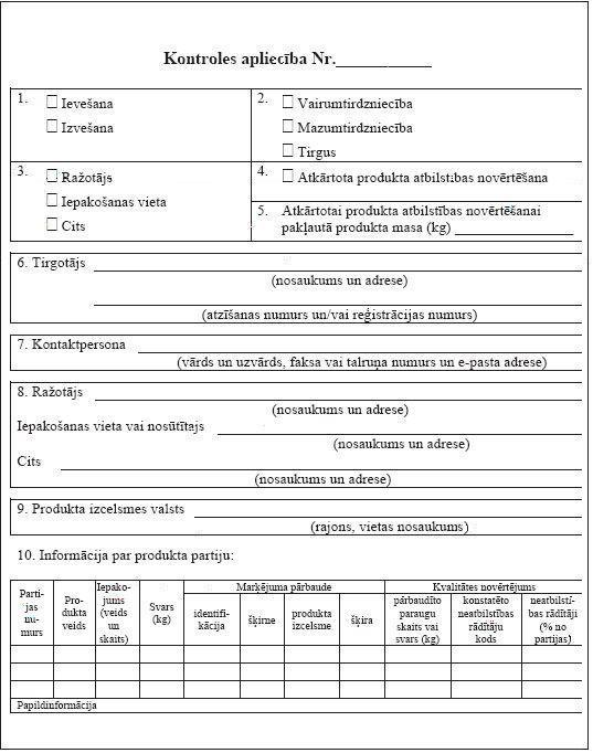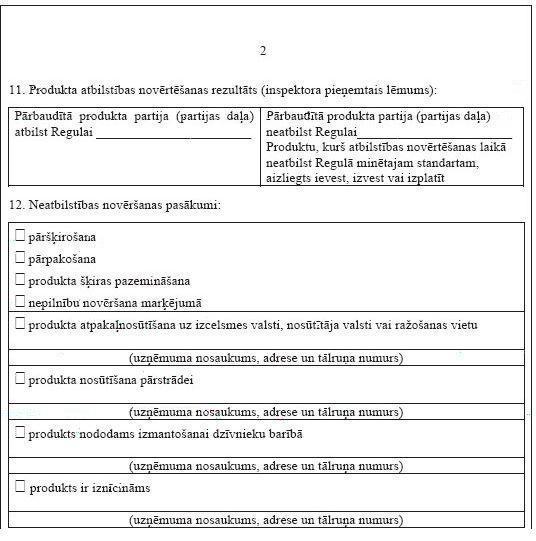 Pārtikas un veterinārā dienesta inspektors _________________, veicot kontroli, konstatējis, ka produkts neatbilst Regulai_______________________________