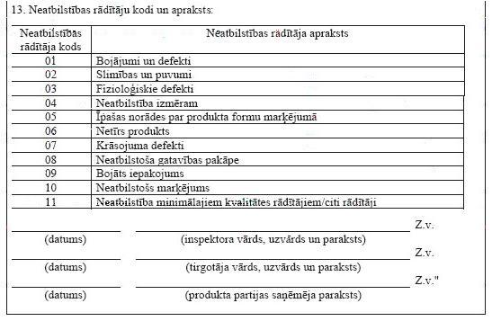 *Neatbilstības rādītāju kodi/code of defects: