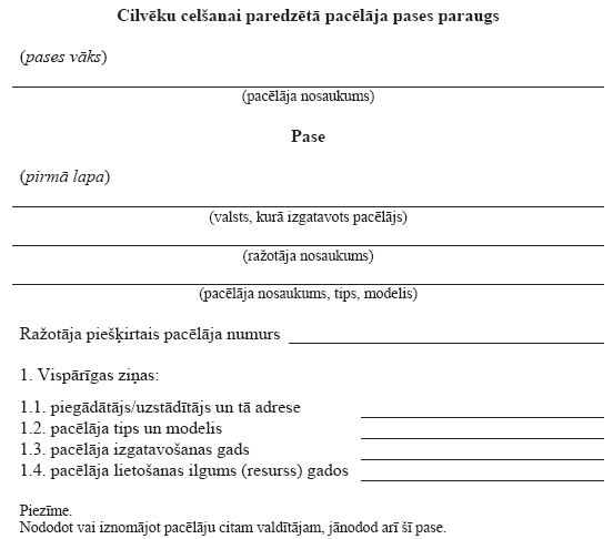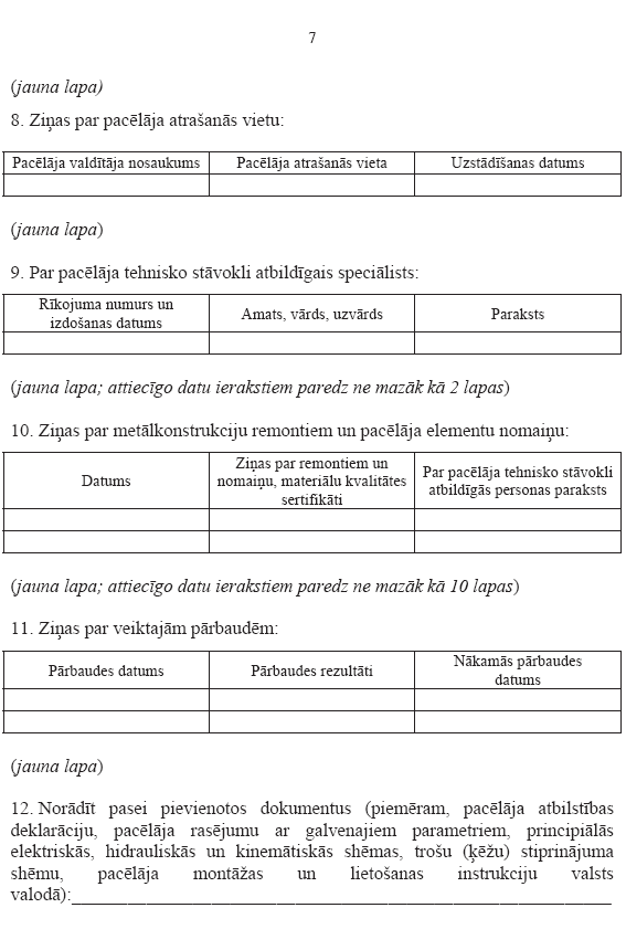 "8. Katram pacēlājam nepieciešama pase valsts valodā. Pasi konkrētam pacēlājam saskaņā ar šo noteikumu 1.pielikumā noteikto pases paraugu aizpilda un datu patiesību apliecina pacēlāja valdītājs. Pasē norāda vismaz šādu informāciju: