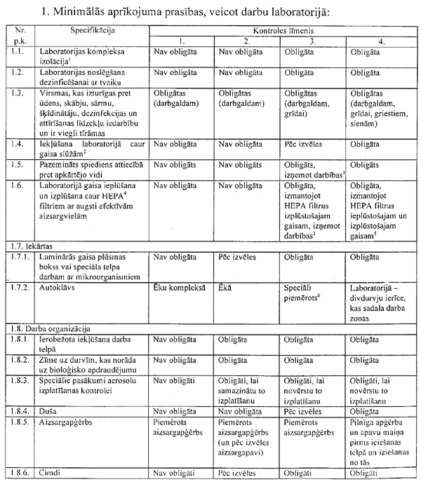 19.2. aprakstīt vispārīgo darba kārtību un kontroles un drošības pasākumus atbilstoši šo noteikumu 1.pielikumam un modificēto organismu ierobežotās izmantošanas klasei, lai garantētu drošību un modificēto organismu viszemāko realizējamo piesārņojuma līmeni darba vietā un apkārtējā vidē;