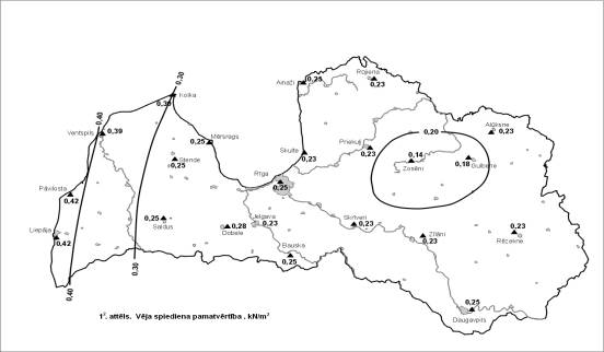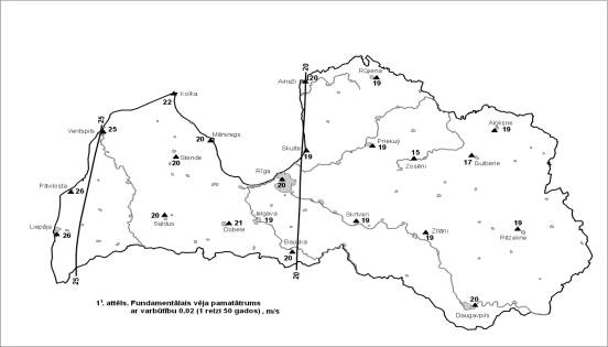 "14.1 1.1 attēls. Fundamentālā vēja pamatātruma vērtība katrā novērojumu punktā noteikta, izmantojot informāciju par katra gada maksimālo vidējo vēja ātrumu 10 minūšu laikposmā neatkarīgi no vēja virziena un gadalaika. Katra gada maksimālā vēja ātruma vērtība pārrēķināta 10 metru augstumam virs līdzena, atklāta lauku apvidus ar teritorijas nelīdzenuma garumu zo 0,05 m. Pārrēķins veikts atbilstoši Pasaules Meteoroloģijas organizācijas ieteiktajai metodikai. Vēja pamatātrums ar varbūtību 0,02 (reizi 50 gados) aprēķināts, izmantojot Gumbela varbūtību sadalījumu.