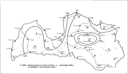 5.14. sniega slodzes uz zemes virsmas raksturīgās vērtības (ar varbūtību 0,02) nosaka saskaņā ar šī būvnormatīva 1.pielikuma 16.1tabulas 2.1attēlu;
