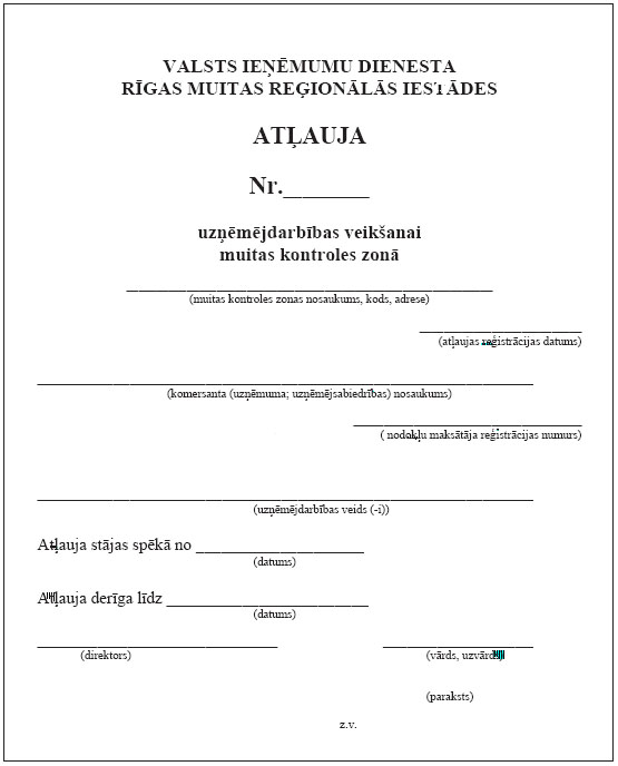 2. Apstiprināt VID Rīgas muitas reģionālās iestādes atļaujas izsniegšanai, pagarināšanai, grozījumu izdarīšanai uzņēmējdarbības veikšanai muitas kontroles zonā veidlapu.