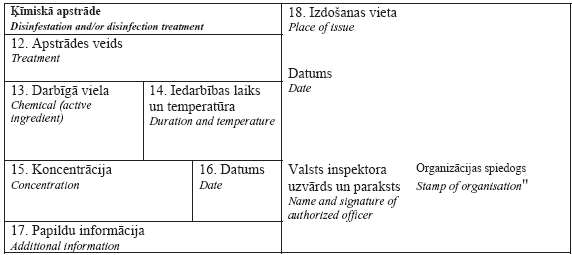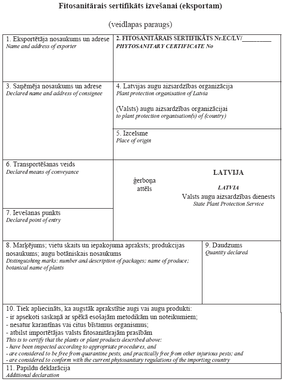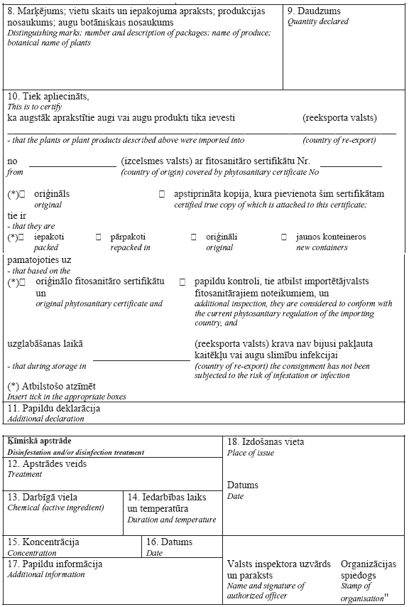 83.31. aizpilda angļu valodā vai citas valsts valodā, kuras lietošanai piekrīt ievedējvalsts. Fitosanitārā sertifikāta otrā pusē var norādīt tipogrāfiski iespiestā teksta tulkojumus citu valstu valodās;