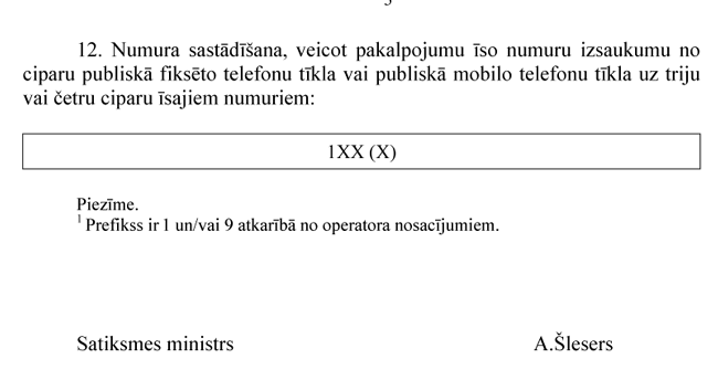 18.Īso kodu, kurš sākas ar ciparu “1”, izmanto tikai speciālajiem pakalpojumiem (piemēram, Valsts ugunsdzēsības un glābšanas dienesta, Valsts policijas, neatliekamās medicīniskās palīdzības un gāzes avārijas operatīvo dienestu, kā arī uzziņu operatoru dienestu pakalpojumiem) triju vai četru ciparu formātā.