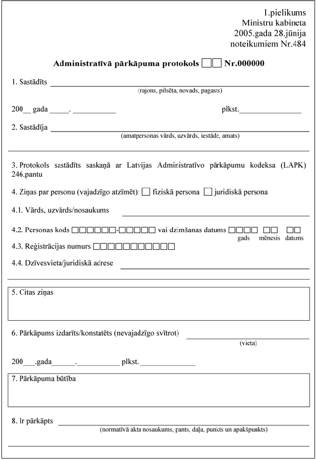7. Administratīvā pārkāpuma protokola veidlapu komplekts sastāv no diviem eksemplāriem. Pirmais eksemplārs paliek protokola sastādītājam, bet otro izsniedz attiecīgajai personai.