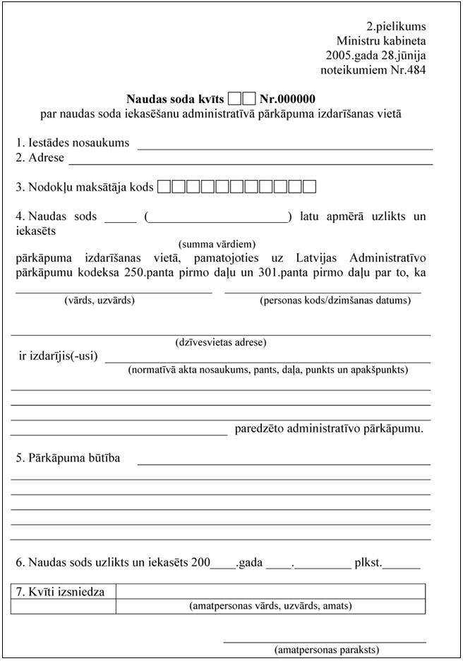 21. Naudas soda kvīts veidlapas izmanto, ja saskaņā ar Latvijas Administratīvo pārkāpumu kodeksa 250.pantu naudas sodu uzliek un iekasē pārkāpuma izdarīšanas vietā. Naudas soda kvīts veidlapas aizpilda skaidri, salasāmi, bez dzēsumiem un svītrojumiem.