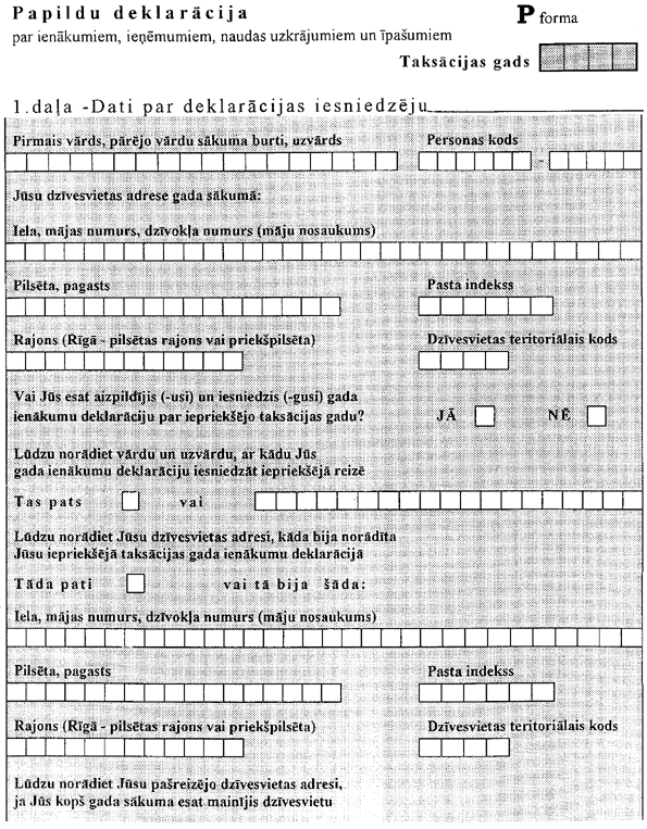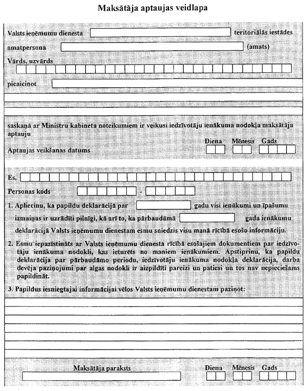 6. Maksātājam ir pienākums ar savu parakstu apliecināt papildu deklarācijas aizpildīšanas pareizību un pilnību. Ar maksātāja parakstu apliecināta papildu deklarācija par pārbaudāmo taksācijas periodu ir pamats turpmākajam ienākuma aprēķinam.