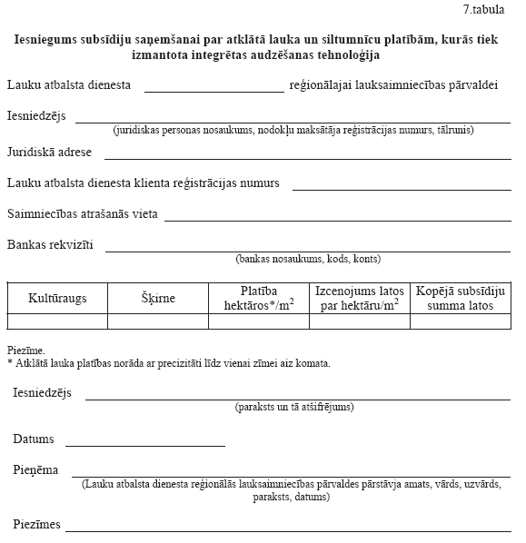 63. Lai saņemtu subsīdijas, pretendents līdz 2005.gada 20.jūlijam iesniedz Lauku atbalsta dienesta reģionālajā lauksaimniecības pārvaldē iesniegumu (7.tabula). Iesniegumā norāda audzējamās kultūras, kā arī platības, kurās paredzēta integrētas dārzeņu audzēšanas tehnoloģijas izmantošana. Iesnieguma kopiju iesniedz asociācijā “Latvijas Dārznieks” attiecīgo platību apsekošanai.