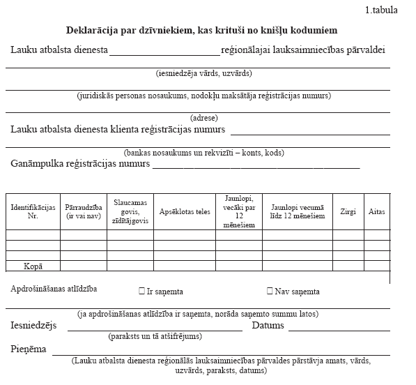 5. Kompensācijas par dzīvniekiem, kas krituši no knišļu kodumiem, var saņemt pretendents, ja tam piederošie mājlopi, ganāmpulks un novietnes ir reģistrētas atbilstoši normatīvajiem aktiem par dzīvnieku, ganāmpulka un novietņu reģistrēšanu un dzīvnieku apzīmēšanu un pretendents līdz 2005.gada 1.augustam ir iesniedzis Lauku atbalsta dienesta reģionālajā lauksaimniecības pārvaldē deklarāciju par kritušajiem dzīvniekiem (1.tabula). Lauku atbalsta dienests veic norēķinus ar pretendentu nedēļas laikā pēc deklarācijas saņemšanas.