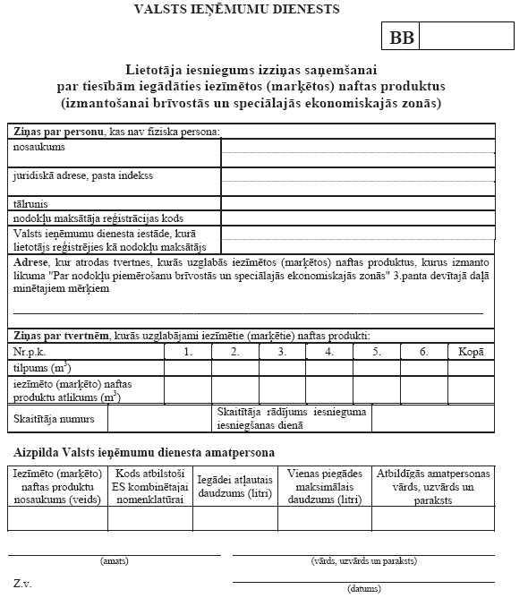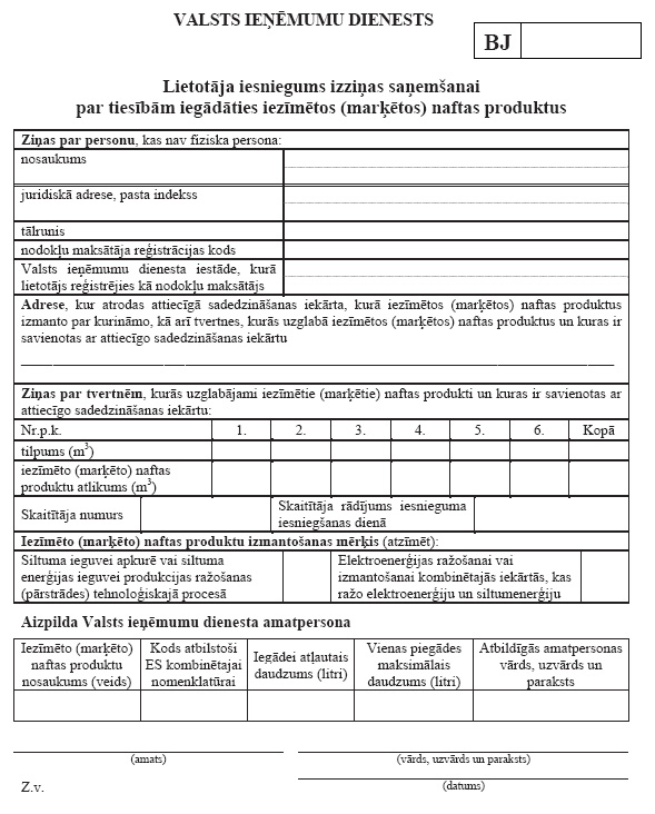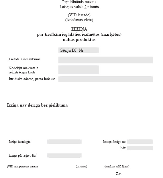 47.Lai iezīmētos (marķētos) naftas produktus varētu izmantot likuma 14.panta otrajā daļā vai 18.panta pirmās daļas 4.punktā noteiktajam mērķim vai likuma “Par nodokļu piemērošanu brīvostās un speciālajās ekonomiskajās zonās” 3.panta astotās daļas 4.punktā vai 3.panta devītajā daļā noteiktajam mērķim, lietotājs saņem izziņu par tiesībām iegādāties iezīmētos (marķētos) naftas produktus (turpmāk — izziņa iezīmēto (marķēto) naftas produktu iegādei).