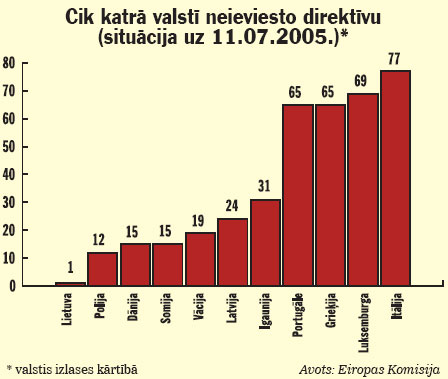 Pašreiz Latvijas likumdošanā nav iestrādātas 19 Eiropas Savienības (ES) direktīvas, “Latvijas Vēstnesim” atklāja Tieslietu ministrijas Sabiedrisko attiecību nodaļas vadītāja Inga Saleniece. Tomēr izsekot, cik īsti direktīvu ir ieviests un cik nav, ir grūti. Latvijā būtu ļoti nepieciešama ES tiesību aktu pārņemšanas ieviešanas kontroles sistēma, kuras izveide ir uzsākta. Ar šādu sistēmu varētu iegūt informāciju par visām direktīvām, kas Latvijai jāpārņem, kā arī par to, vai konkrētās direktīvas prasības iestrādātas nacionālajā likumdošanā. Tas būtiski vienkāršotu iespēju izsekot direktīvu pārņemšanai.