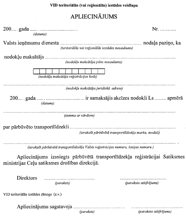 Valsts ieņēmumu dienesta teritoriālajām iestādēm nodrošināt apliecinājuma izsniegšanu nodokļu maksātājiem gadījumos, kad akcīzes nodoklis ir samaksāts par pārbūvētajiem transportlīdzekļiem. Apliecinājums (pēc rīkojumam pievienotā parauga) izsniedzams pēc nodokļu maksātāja pieprasījuma un iesniedzams Satiksmes ministrijas Ceļu satiksmes drošības direkcijai.