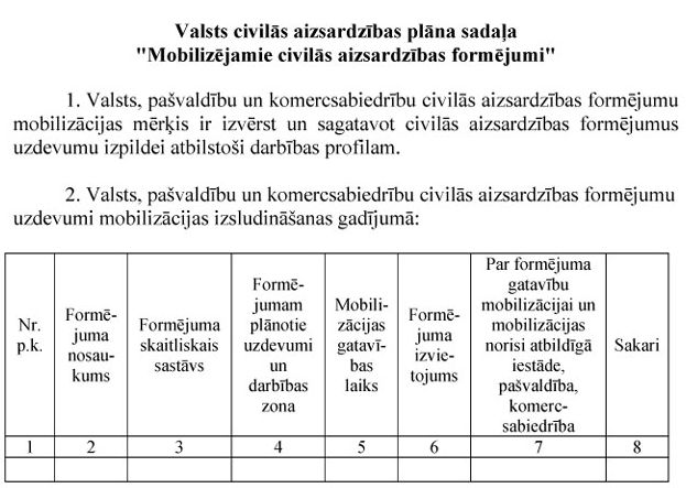 4.3. Valsts civilās aizsardzības plāna sadaļu “Mobilizējamie civilās aizsardzības formējumi” un mobilizējamo civilās aizsardzības formējumu mobilizācijas plānus.