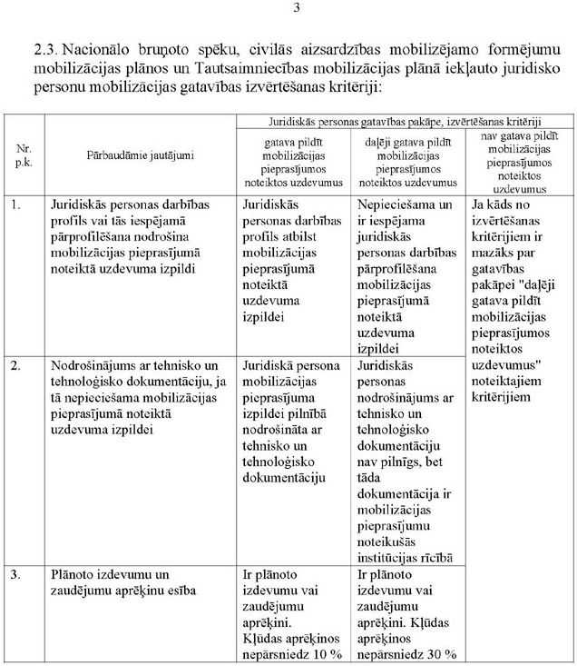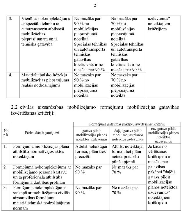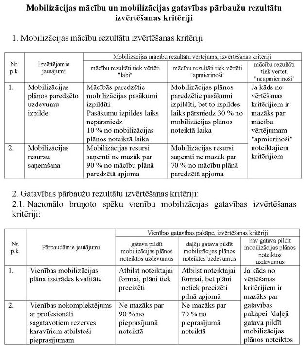 1.2. mobilizācijas gatavības pārbaužu un mobilizācijas mācību rezultātu izvērtēšanas kritērijus;