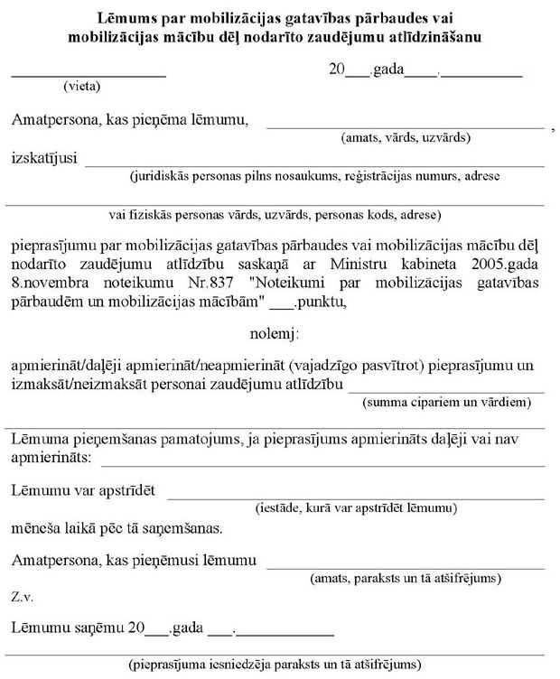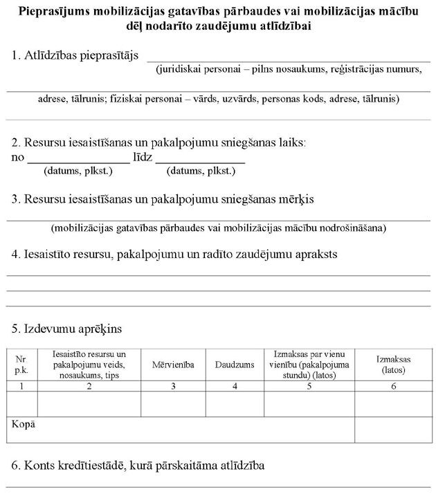 1.3. mobilizācijas gatavības pārbaudei pakļautajām vai mobilizācijas mācībās iesaistītajām valsts un pašvaldību iestādēm, kā arī Latvijas Republikā reģistrētajām juridiskajām personām un iedzīvotājiem nodarīto zaudējumu segšanas kārtību un apmēru;