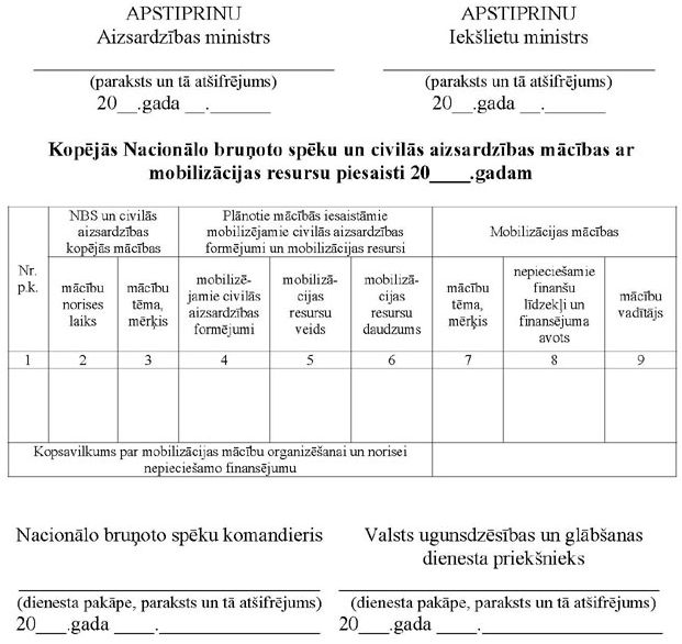 25.1. Ministru prezidents — kopējām Nacionālo bruņoto spēku un civilās aizsardzības formējumu mobilizācijas mācībām;
