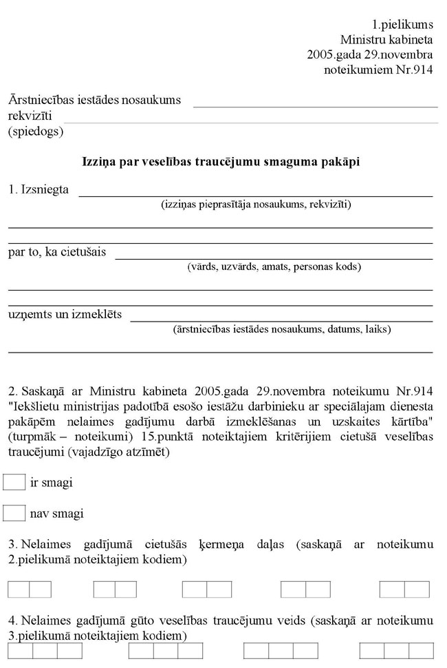 14.Ārstniecības iestāde triju dienu laikā pēc iestādes vai ministrijas pieprasījuma saņemšanas bez maksas izsniedz izziņu par veselības traucējumu smaguma pakāpi saskaņā ar šo noteikumu 1.pielikumu. Izziņā norāda, vai veselības traucējumi ir smagi vai nav smagi (atbilstoši šo noteikumu 15.punktam), kā arī nelaimes gadījumā cietušo ķermeņa daļu (atbilstoši šo noteikumu 2.pielikumā noteiktajai klasifikācijai) un nelaimes gadījumā gūto veselības traucējumu veidu (atbilstoši šo noteikumu 3.pielikumā noteiktajai klasifikācijai).