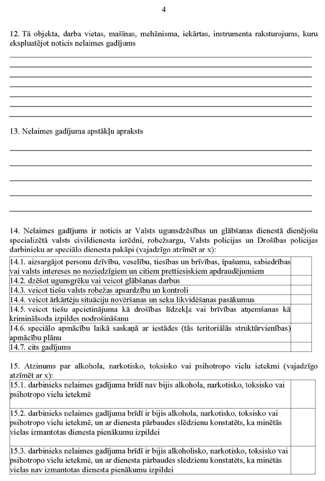 12.Ja nav iespējams notikuma vietu saglabāt neskartu, darba devējs uzreiz pēc nelaimes gadījuma nodrošina nelaimes gadījuma vietā esošās situācijas dokumentālu fiksēšanu.
