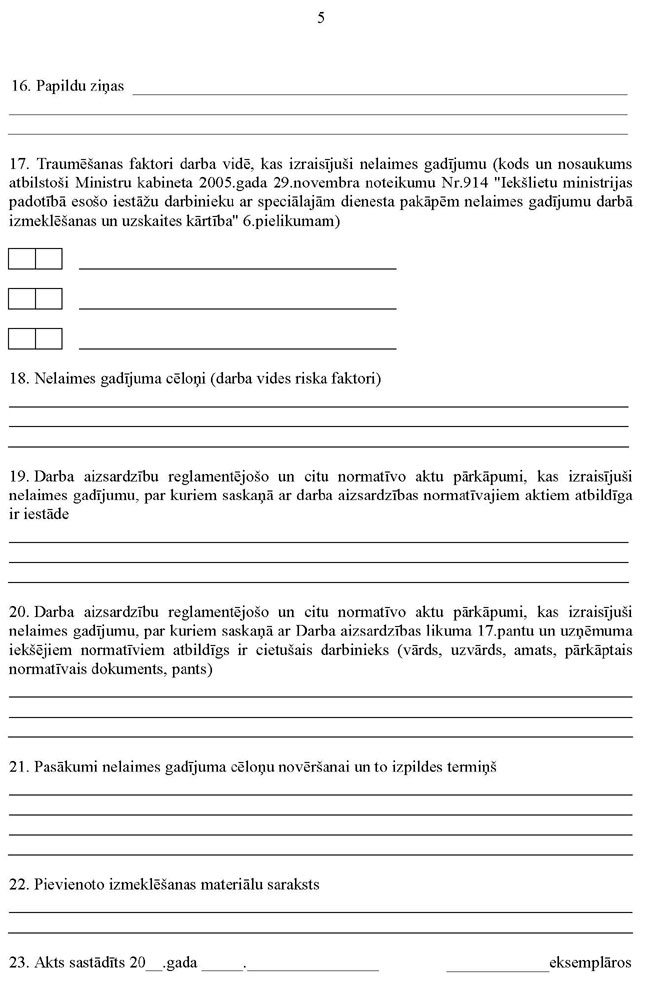 22.Aktā norāda traumēšanas faktorus saskaņā ar šo noteikumu 6.pielikumu, nelaimes gadījuma cēloņus, kā arī pasākumus nelaimes gadījuma cēloņu novēršanai.