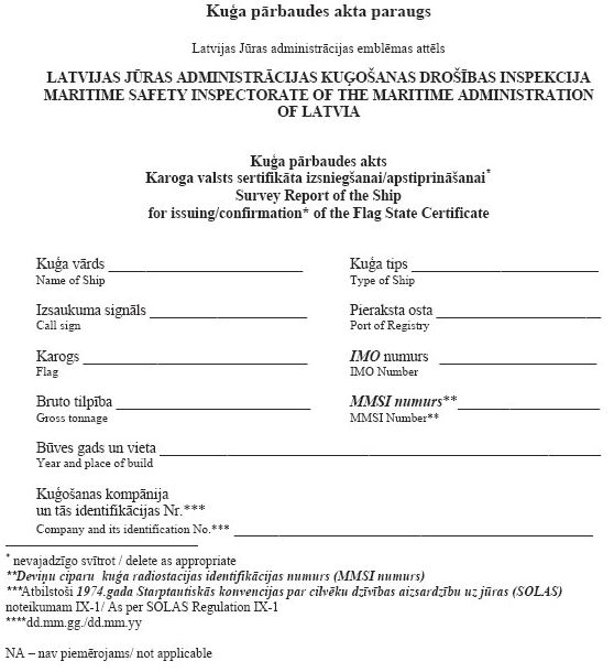 9. Kuģus, kas saskaņā ar šo noteikumu prasībām ir klasifikācijas sabiedrību uzraudzībā, inspekcija pārbauda, lai pārliecinātos par kuģu atbilstību klasifikācijas sabiedrību izsniegtajiem sertifikātiem, kā arī lai pārbaudītu kuģa apkalpes, ekspluatācijas un apkopes atbilstību Jūrlietu pārvaldes un jūras drošības likumā noteikto normatīvo aktu prasībām. Pārbaudes rezultātus inspekcija apkopo kuģa pārbaudes aktā (1.pielikums). Ja pārbaudes rezultāti ir pozitīvi, inspekcija šādam kuģim izsniedz karoga valsts sertifikātu (2.pielikums).
