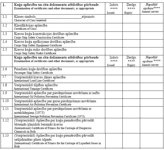 2.1. kuģu pārbaudes, lai novērtētu to konstrukcijas, tehniskā stāvokļa, aprīkojuma, apkalpes, ekspluatācijas un apkopes atbilstību Jūrlietu pārvaldes un jūras drošības likumā definēto normatīvo aktu prasībām;