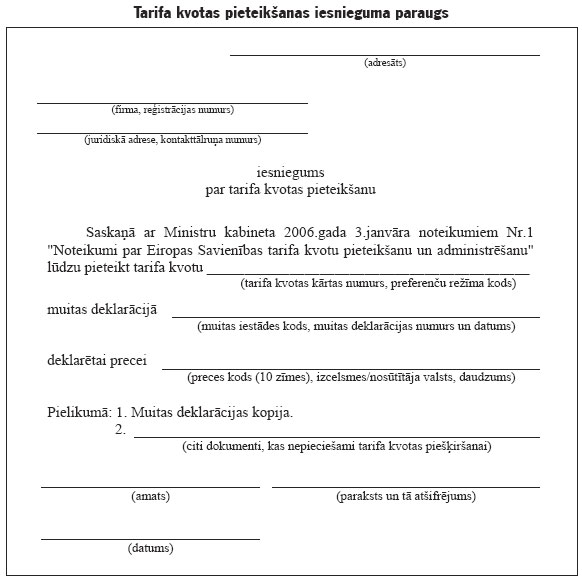6. Lai pieteiktu tarifa kvotu pēc preču izlaišanas, deklarētājs iesniedz Valsts ieņēmumu dienesta Galvenajā muitas pārvaldē tarifa kvotas pieteikšanas iesniegumu (pielikums). Iesniegumam pievieno attiecīgās muitas deklarācijas kopiju un citus tarifa kvotas piešķiršanai nepieciešamos dokumentus, ja tas ir noteikts attiecīgajā normatīvajā aktā.