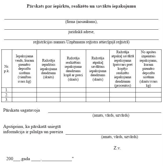 "30. Ražotājs, kas izmanto depozīta iepakojumu, divas reizes kalendāra gadā sagatavo pārskatu par iepirkto, realizēto un atpakaļ savākto depozīta iepakojumu saskaņā ar šo noteikumu 3.pielikumu. Pārskatu: