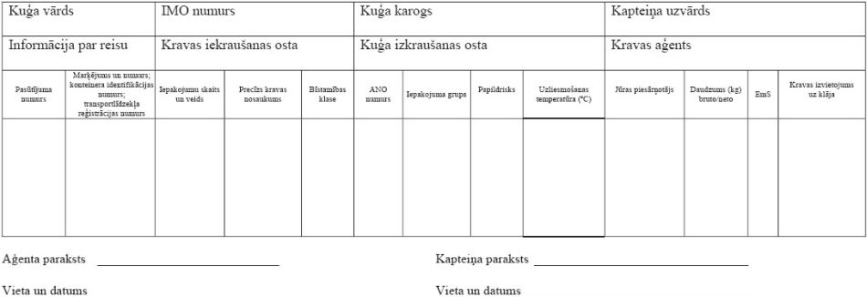 (saskaņā ar SOLAS konvencijas VII nodaļas 5(5) noteikumā, MARPOL 73/78 III pielikuma 4(3) noteikumā un IMDG kodeksa 5.4.nodaļas 5.4.3.1.paragrāfā minētajām prasībām)