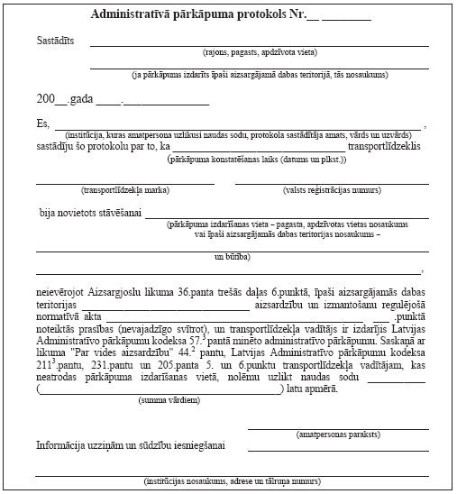 1.1. kārtību, kādā amatpersona, kas izskata administratīvos pārkāpumus par transportlīdzekļu pārvietošanās, tajā skaitā apstāšanās un stāvēšanas, noteikumu pārkāpumiem ārpus autoceļiem Baltijas jūras un Rīgas jūras līča piekrastes krasta kāpu aizsargjoslā, pludmalē vai īpaši aizsargājamā dabas teritorijā (turpmāk – transportlīdzekļa pārvietošanās noteikumu pārkāpums), bez transportlīdzekļa vadītāja klātbūtnes sastāda administratīvā pārkāpuma protokolu – paziņojumu par transportlīdzekļu apstāšanās un stāvēšanas noteikumu pārkāpšanu (turpmāk – protokols);