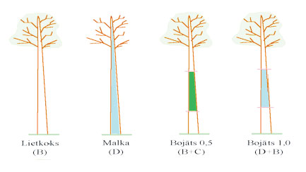 2 (AB), (BC) – sortimenti, kuros apvienoti dažādas kvalitātes apaļkoku sortimenti.