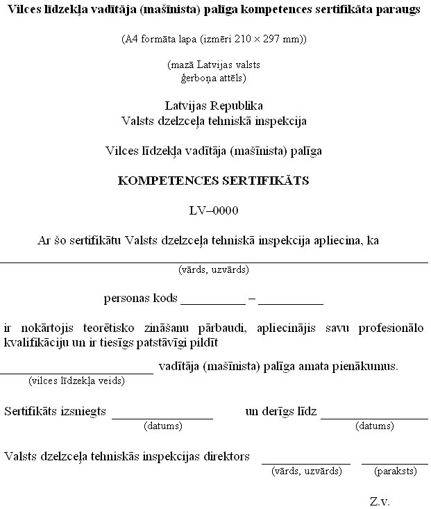 2. Mašīnista instruktora, mašīnista vai mašīnista palīga profesionālo kompetenci apliecina attiecīgs sertifikāts (1., 2. un 3.pielikums) un tam pievienotā apliecība (4., 5. un 6.pielikums). Sertifikātus un apliecības izsniedz Valsts dzelzceļa tehniskā inspekcija (turpmāk — inspekcija).
