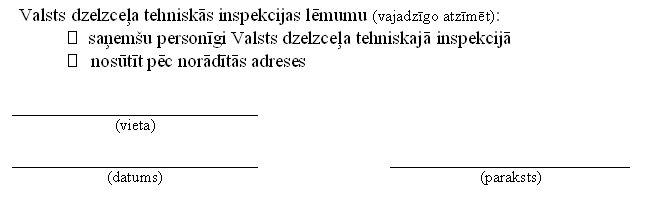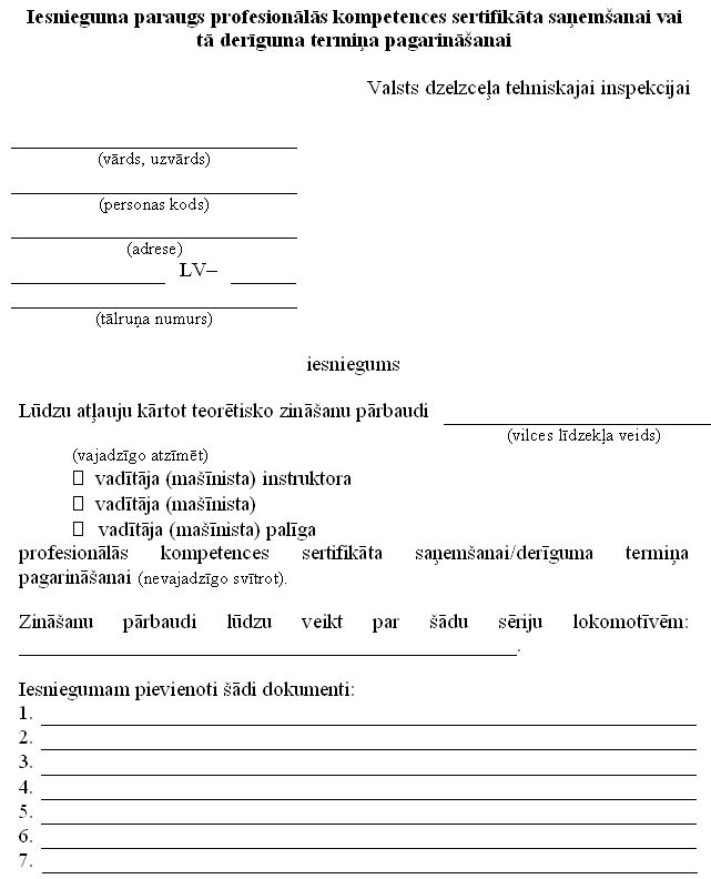 15. Persona, kas vēlas saņemt mašīnista instruktora sertifikātu, iesniedz inspekcijā iesniegumu sertifikāta saņemšanai vai tā derīguma termiņa pagarināšanai (7.pielikums) un uzrāda personu apliecinošu dokumentu. Iesniegumam pievieno: