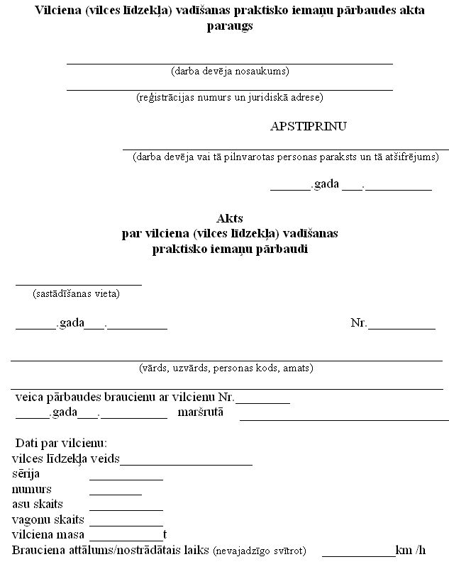 16.5. darba devēja apstiprinātu aktu par vilciena (vilces līdzekļa) vadīšanas praktisko iemaņu pārbaudi (8.pielikums). Pārbaudi veic ne mazāk kā 100 kilometru garā vilciena maršrutā vai vienas pilnas maiņas laikā manevru darbos. Akta derīguma termiņš ir divi mēneši;