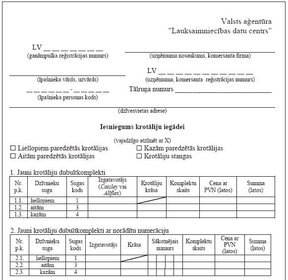 Iesnieguma paraugs liellopu, aitu un kazu krotāliju iegādei
