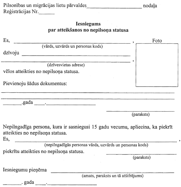 7. Nepilngadīgā persona, kura ir sasniegusi 15 gadu vecumu, iesniegumā ar parakstu apliecina, ka piekrīt atteikties no nepilsoņa statusa.