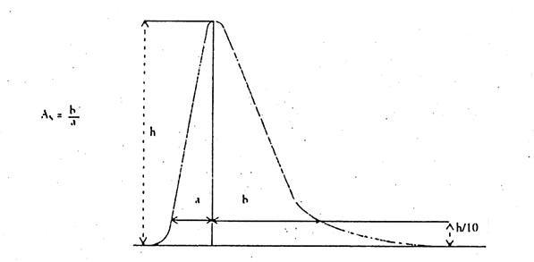 503.2.3.6.2. Asimetrijas faktors: visi iegūtie pīķi ir 0,9–1,5 (pīķu asimetrijas faktors definēts šī pielikuma 13.attēlā). Lai uzņemtu hromatogrammu asimetrijas faktora noteikšanai, ieteicams pašrakstītāja ātrums vismaz 2 cm minūtē.