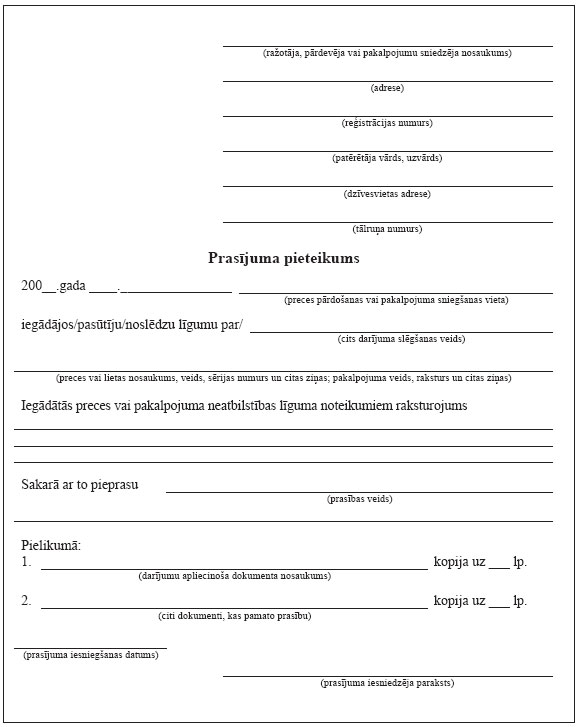3. Ražotāja, pārdevēja vai pakalpojumu sniedzēja pienākums ir pieņemt un izskatīt patērētāja prasījumu. Patērētājs prasījumu var izteikt mutiski vai iesniegt rakstisku prasījuma pieteikumu (arī nosūtot pa pastu).