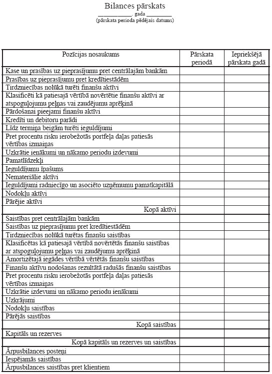 6. Banka sagatavo pārskatu, kurā atspoguļo informāciju par tās finansiālo stāvokli un darbību no pārskata gada sākuma līdz 31. martam, 30. jūnijam, 30. septembrim un 31. decembrim (tālāk tekstā — pārskata periods), nodrošinot, ka pārskats ir brīvi pieejams bankas juridiskajā adresē un visās bankas filiālēs bez maksas vai par maksu, kas nepārsniedz pamatotas kopēšanas izmaksas, kā arī pārskatu ievieto bankas interneta mājas lapā. Pārskatam jābūt brīvi pieejamam ne vēlāk kā divu mēnešu laikā pēc atbilstošā pārskata perioda beigām.