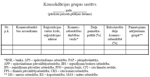 Ja saskaņā ar Komisijas apstiprinātajiem “Banku konsolidētās uzraudzības noteikumiem” banka ir bankas grupas vai finanšu pārvaldītājsabiedrības grupas (tālāk tekstā — konsolidācijas grupa) atbildīgā banka, par katru konsolidācijas grupā iekļauto banku, finanšu iestādi vai palīguzņēmumu, kā arī par citām grupas meitas sabiedrībām atklāj 4.pielikumā norādīto informāciju: