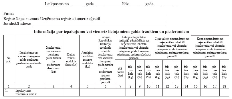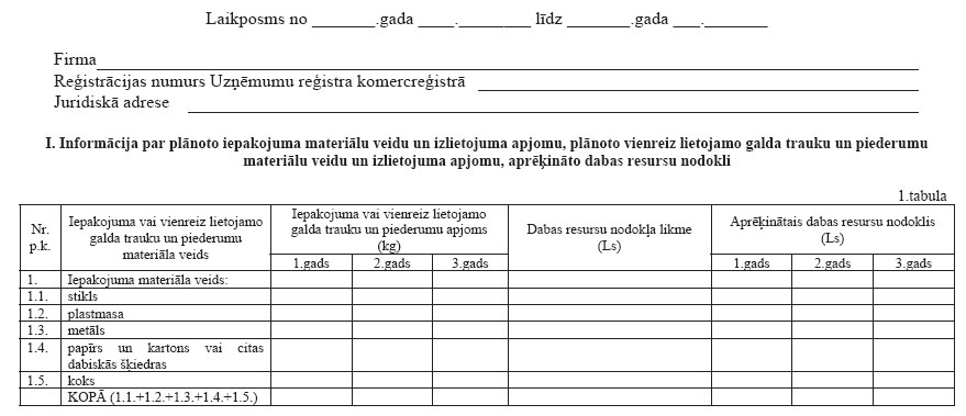 4.1. iesniegumu par atbrīvojuma piemērošanu. Iesniegumā norāda nodokļa maksātāja firmu, reģistrācijas numuru Uzņēmumu reģistra komercreģistrā, juridisko adresi un ziņas par saņemto attiecīgo vides aizsardzības normatīvajos aktos noteikto atļauju, ja nodokļa maksātājs pats veic izlietotā iepakojuma vai vienreiz lietojamo trauku reģenerāciju;