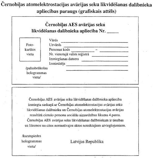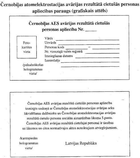 Noteikumi par Černobiļas atomelektrostacijas avārijas seku likvidēšanas dalībnieka apliecības paraugu un Černobiļas atomelektrostacijas avārijas rezultātā cietušās personas apliecības paraugu