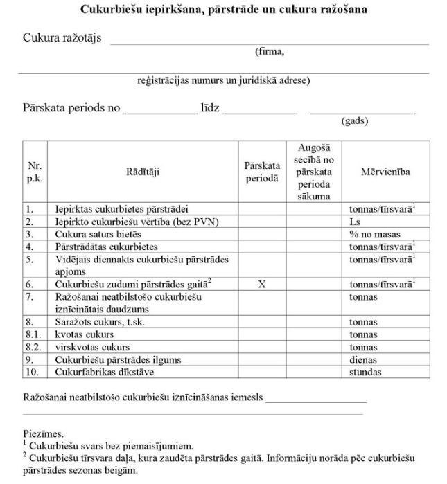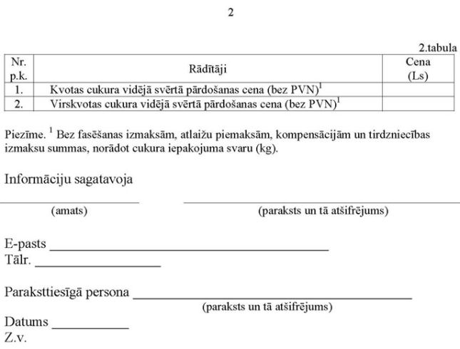 2.3. cukura tirgus resursi, pārdošana un cukura pārdošanas cena (3.pielikums). Informāciju sniedz par katru mēnesi līdz nākamā mēneša divdesmitajam datumam, cukura daudzumu izsakot baltā cukura ekvivalentā, datus norādot augošā secībā no pārskata perioda attiecīgā gada 1.septembra;