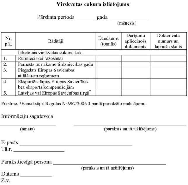 2.4. virskvotas cukura izlietojums (4.pielikums). Informāciju sniedz par katru mēnesi līdz nākamā mēneša divdesmitajam datumam, ja attiecīgajā mēnesī ir notikušas izmaiņas virskvotas cukura izlietojumā;