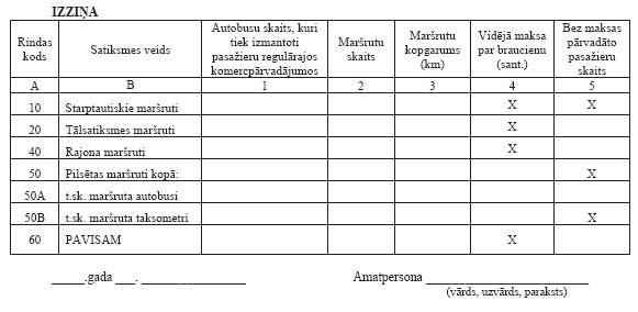 5) 5.ailē norāda pasažierkilometrus. Rajonu, tālsatiksmes un starptautiskajā satiksmē pasažierkilometrus aprēķina, ieņēmumu kopsummu dalot ar noteikto tarifu par viena kilometra nobraukumu. Pilsētu satiksmē pasažierkilometrus aprēķina, pasažieru skaitu reizinot ar vidējo pārvadājumu attālumu, kuru nosaka, izpētot pasažieru plūsmu;