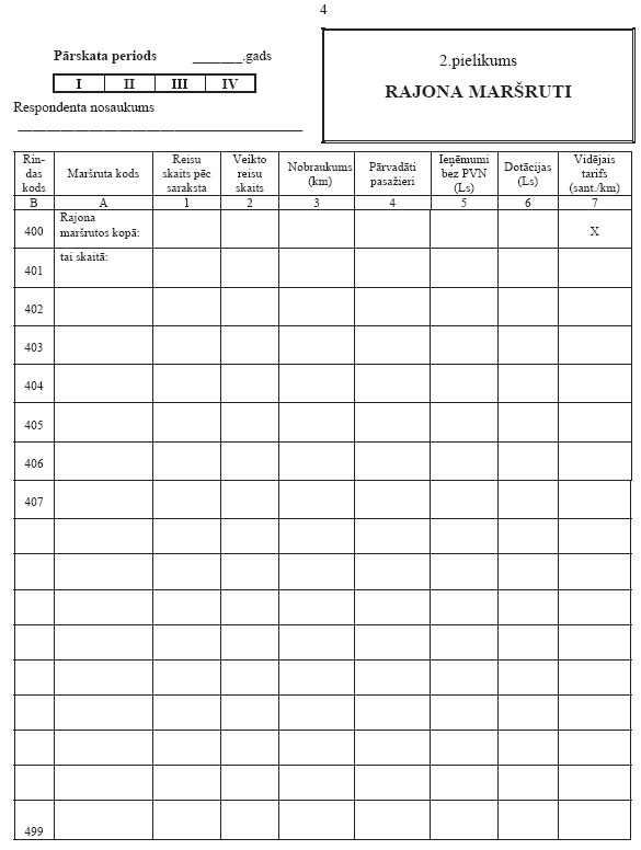Katru rajona maršrutu norāda atsevišķā rindā, maršruta kodu ieraksta "B" ailē. "A" ailē ieraksta piešķirto rindas kodu, sākot no 401 līdz 499.