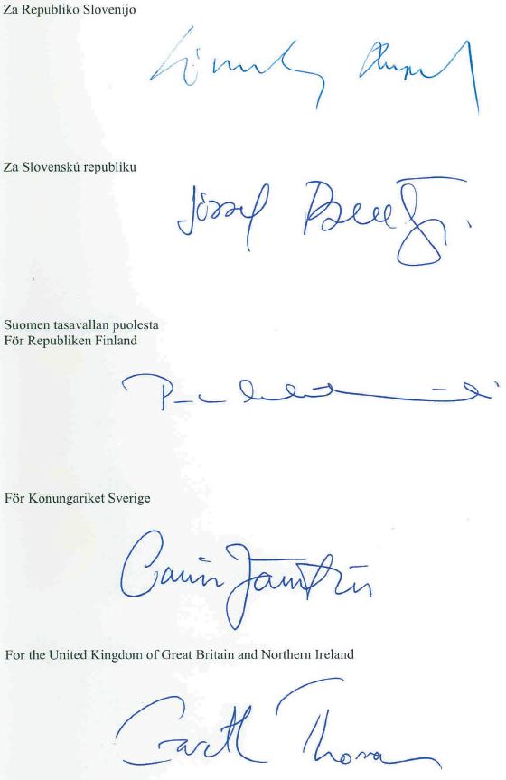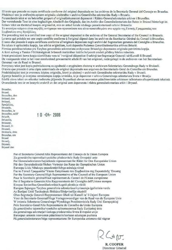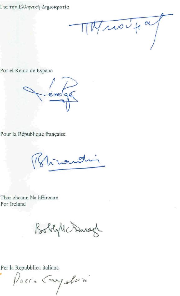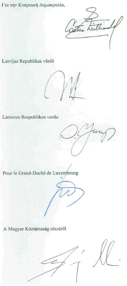 Šo nolīgumu, kurš sastādīts vienā oriģināleksemplārā angļu, čehu, dāņu, franču, grieķu, holandiešu, igauņu, itāliešu, latviešu, lietuviešu, maltiešu, poļu, portugāļu, slovāku, slovēņu, somu, spāņu, ungāru, vācu un zviedru valodā un kura visi divdesmit teksti ir vienlīdz autentiski, deponē Padomes Ģenerālsekretariāta arhīvā, kas izsniedz apstiprinātu norakstu visu parakstītāju valstu valdībām.".