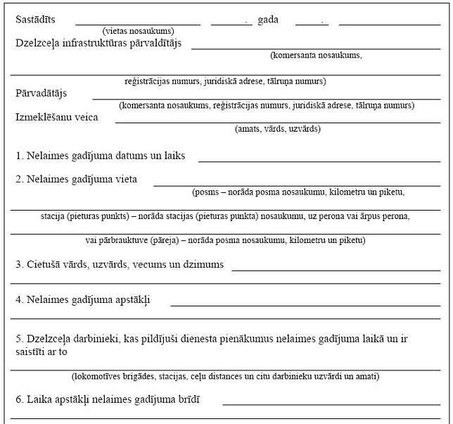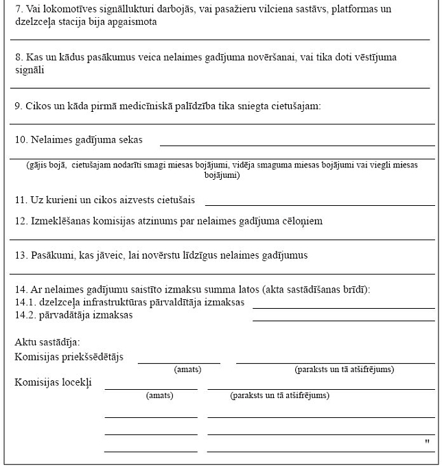 21. Ja nelaimes gadījumā cietis cilvēks, attiecīgā izmeklēšanas komisija sešu darbdienu laikā pēc nelaimes gadījuma sastāda aktu par nelaimes gadījumu, kurā cietis cilvēks (4.pielikums). Triju darbdienu laikā tā eksemplāru kopā ar visiem izmeklēšanas materiāliem (piemēram, vilces līdzekļa brigādes un aculiecinieku paskaidrojumi, izraksts no ātrummērītāja lentes atšifrējuma, nelaimes gadījuma shēma, attiecīgās komisijas sanāksmes protokols) nosūta Dzelzceļa policijai, izmeklēšanas institūcijai, Valsts dzelzceļa tehniskajai inspekcijai, dzelzceļa satiksmes negadījumā iesaistītajam dzelzceļa infrastruktūras pārvaldītājam un pārvadātājam."