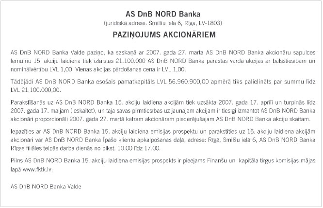 A/s “Nordeka” akcionāri var pieteikt savu akciju bloķēšanu savam vērtspapīru konta turētājam ne vēlāk kā līdz 2007.gada 15.maija darba dienas beigām.